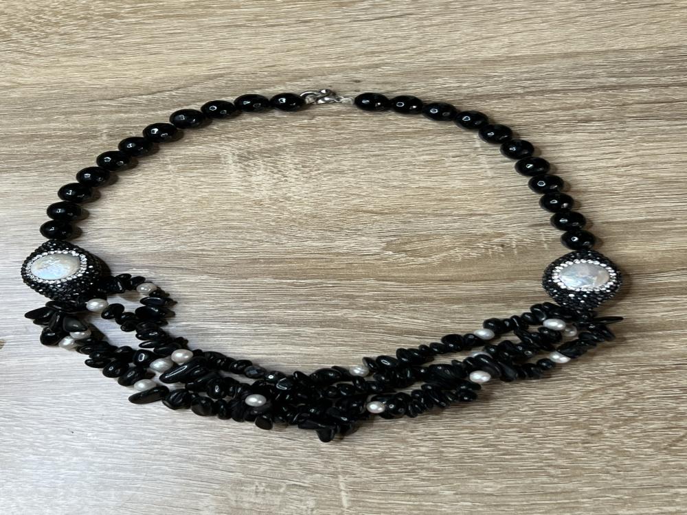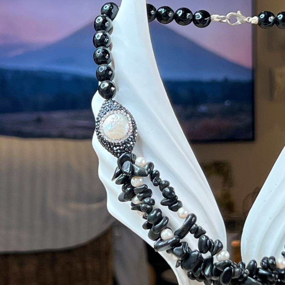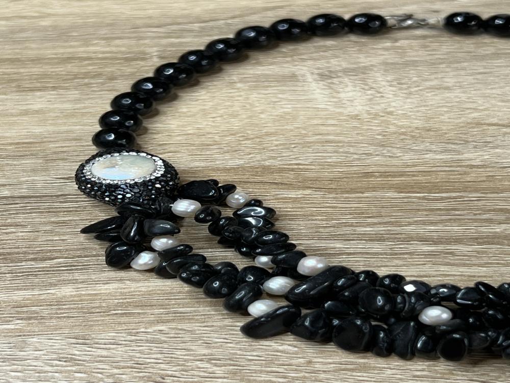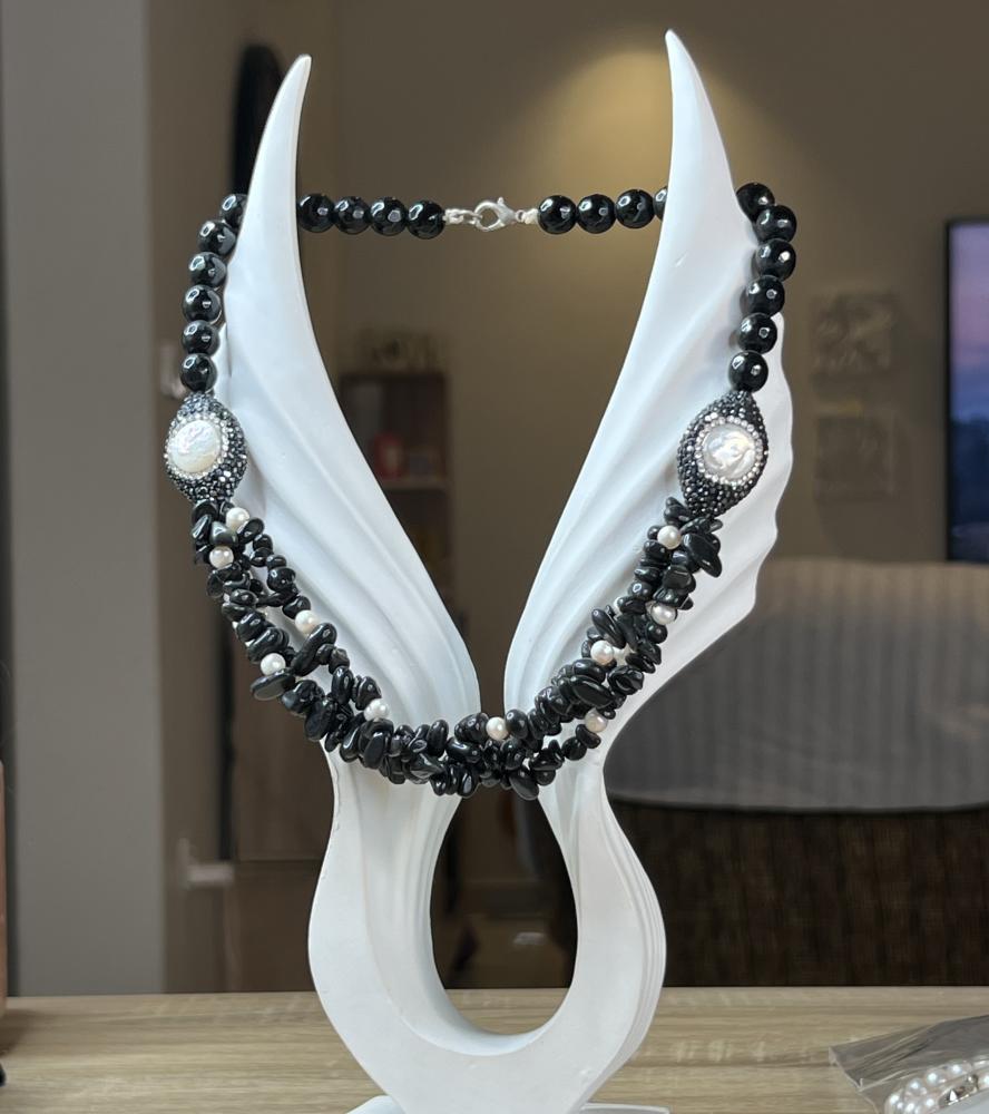 قلادة الأونيكس (العقيق الأسود) مع اللؤلؤ – توازن بين الغموض والنقاء