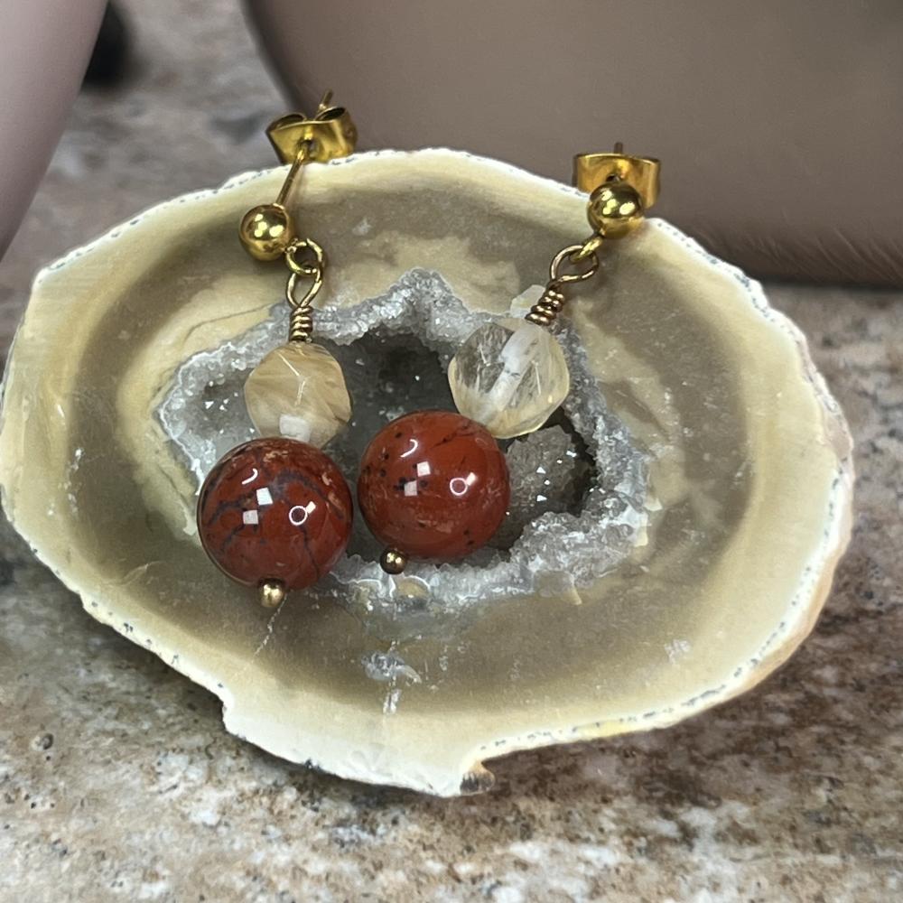 - الحلق: مصنوع من الجاسبر والسترين، بتصميم أنيق يوازن بين الألوان الترابية والبريق الذهبي.