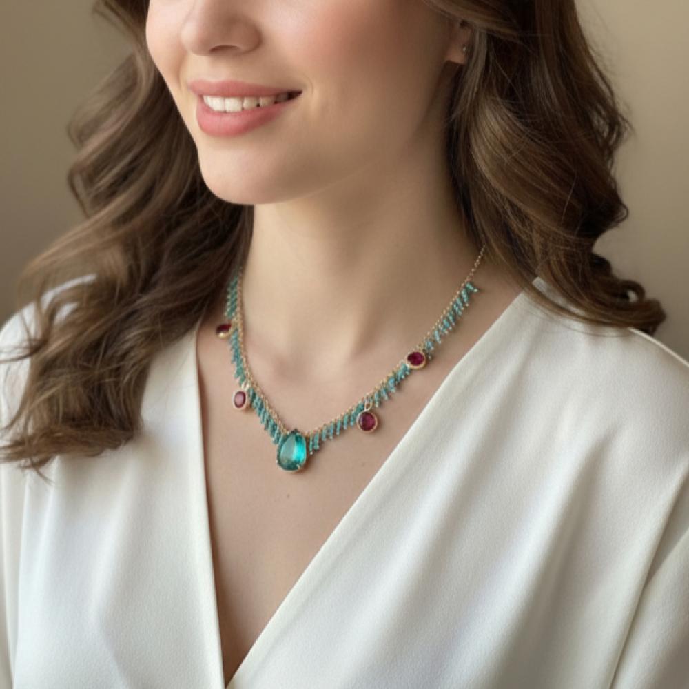 أبرزي أناقتك وجمالك الطبيعي مع هذه القلادة المصنوعة من الفضة 925 والمطلية بالذهب، والمزينة بمزيج فريد من الأفنتورين الأخضر الذي يرمز للهدوء والتوازن، والفيـروز الذي يعكس الصفاء والطاقة الإيجابية، والروبي شتان الذي يضيف لمسة من الشغف والدفء.