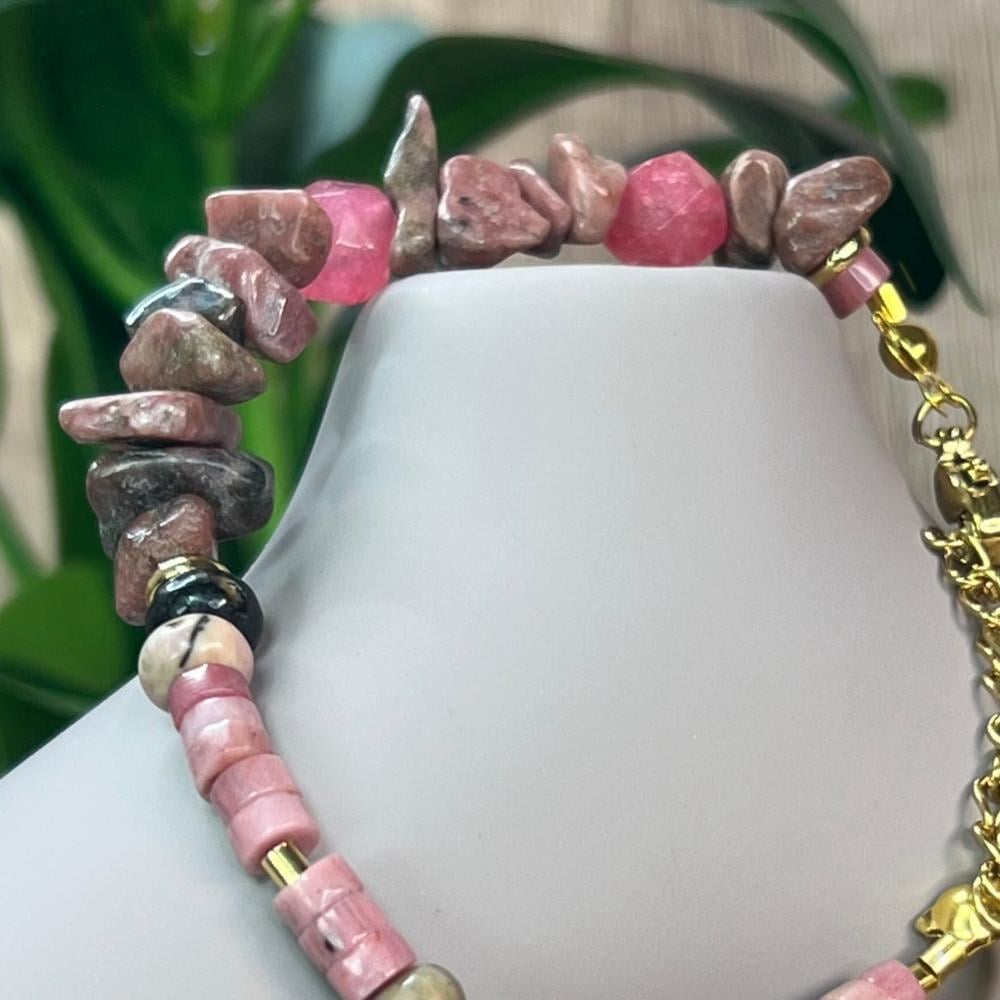 إسوارة أنيقة تجمع بين جمال الرودونايت الطبيعي 100% بلونه الوردي الممزوج بخطوط داكنة، وصفاء الكورتس (Quartz) النقي، لتكون أكثر من مجرد إكسسوار؛ فهي قطعة تحمل طاقة ومعنى: