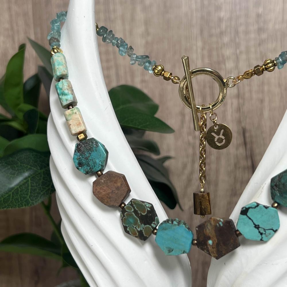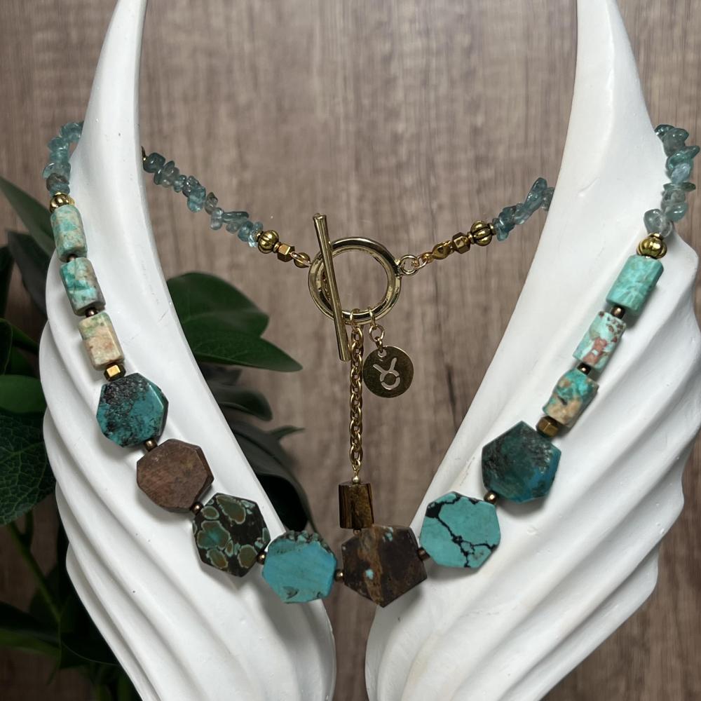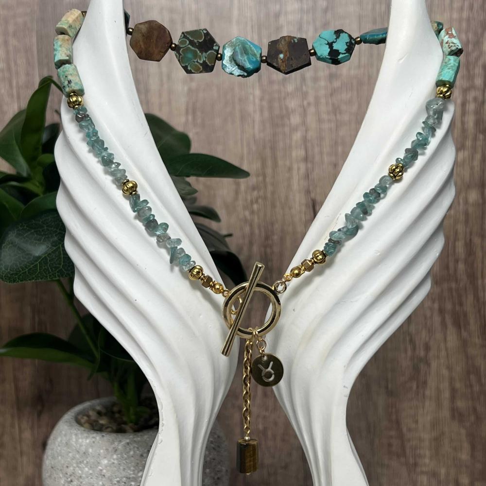 قلادة اللاريمار والأكوا مارين مع تعليقة برج – طاقة الصفاء والتوازن (تصميم بوجهين)قطعة فريدة تجمع بين اللاريمار بلونه الأزرق السماوي والأكوا مارين بصفائه البحري، لتمنحك إحساسًا بالهدوء والتوازن في كل إطلالة.