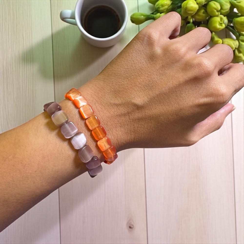 إسوارتان أنيقتان مصنوعتان من حجر كات آي الطبيعي بتدرجين مميزين — بنفسجي فاتح وبرتقالي — يرمزان للصفاء والطاقة الإيجابية.