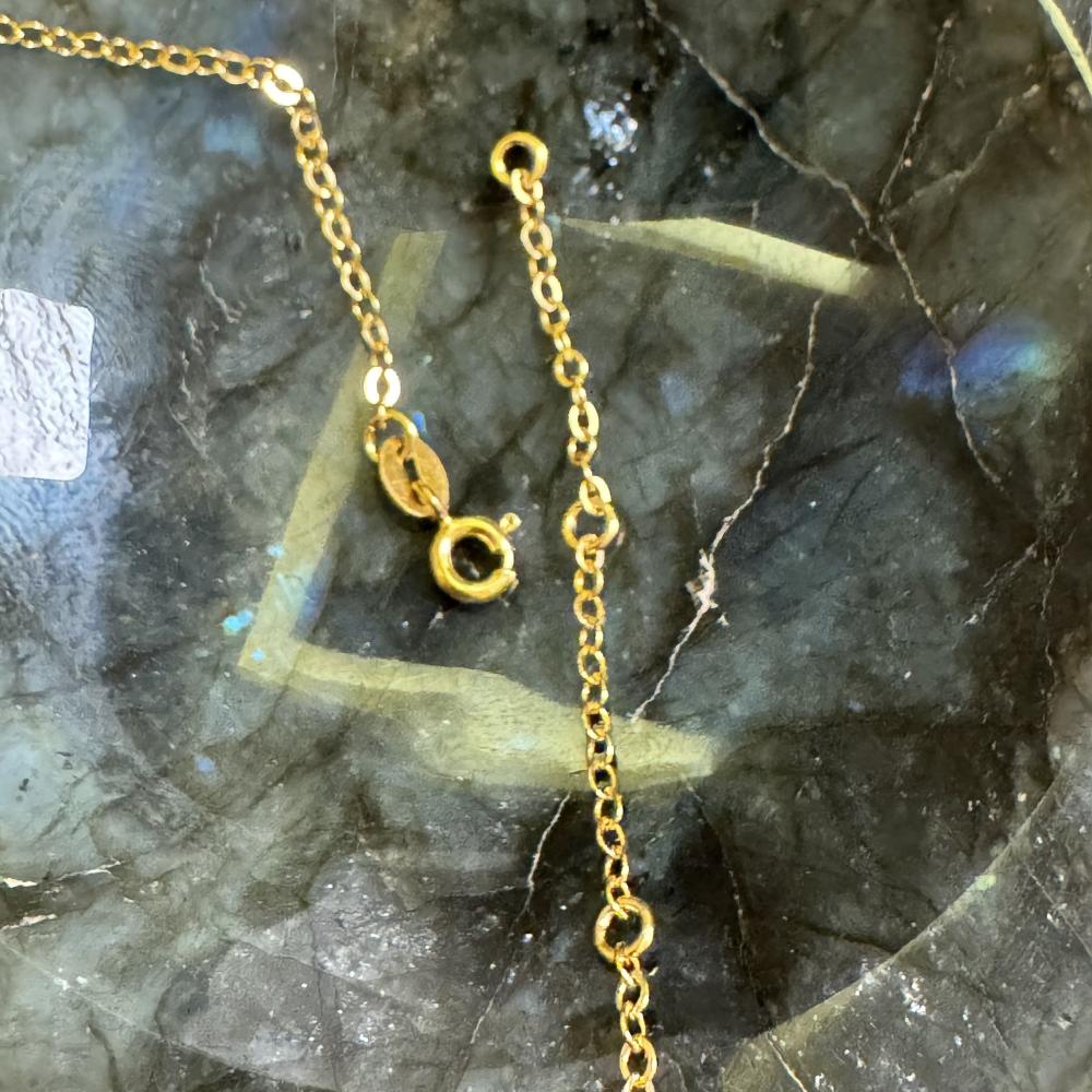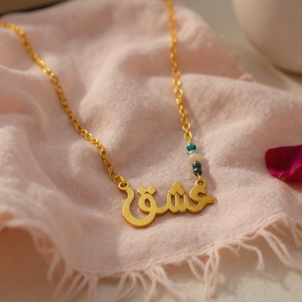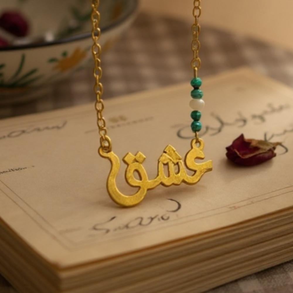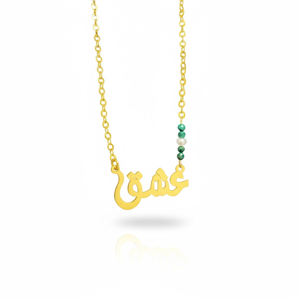 أضف لمسة من الأناقة والتميز مع هذه القلادة المصنوعة من الفضة 925 والمطلية بالذهب، والمزينة بكلمة "عشق" تتألق بحجر الملكايت الطبيعي الغني بدرجاته الخضراء وحبة لؤلؤ طبيعية تضيف لمسة من النقاء والرقي.