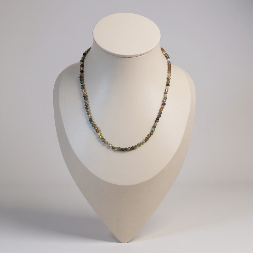 تميّزي بإطلالة طبيعية أنيقة مع هذا الشوكر المصنوع من حجر عقيق موسى الطبيعي، بألوانه الممزوجة التي تعكس جمال الأرض وسحر الطبيعة. تصميم عصري يضفي لمسة فريدة على إطلالتك اليومية والرسمية.