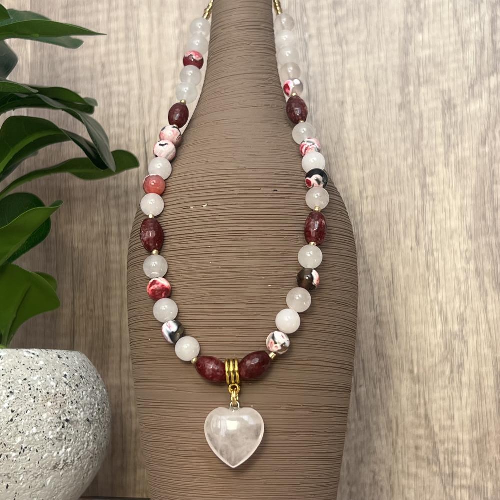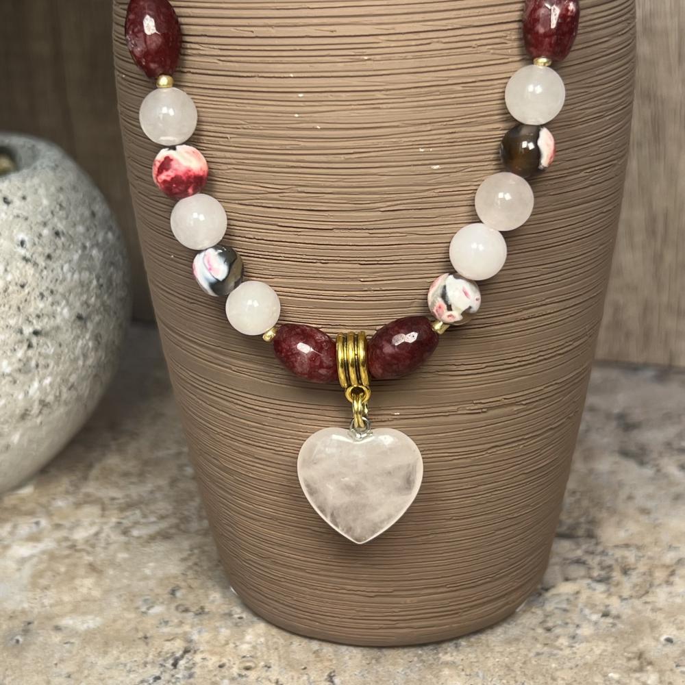 قلادة مميزة تجمع بين ثلاثة من أرقى الأحجار الكريمة الطبيعية: الروز كوارتز بحضوره الناعم الذي يرمز للحب والانسجام، والأجات بطاقة الأرض التي تمنح التوازن والهدوء، مع لمسة من الياقوت (روبي) الفاخر الذي يرمز للقوة والشغف. ليست مجرد إكسسوار، بل قطعة تحمل معنى وطاقة خاصة.