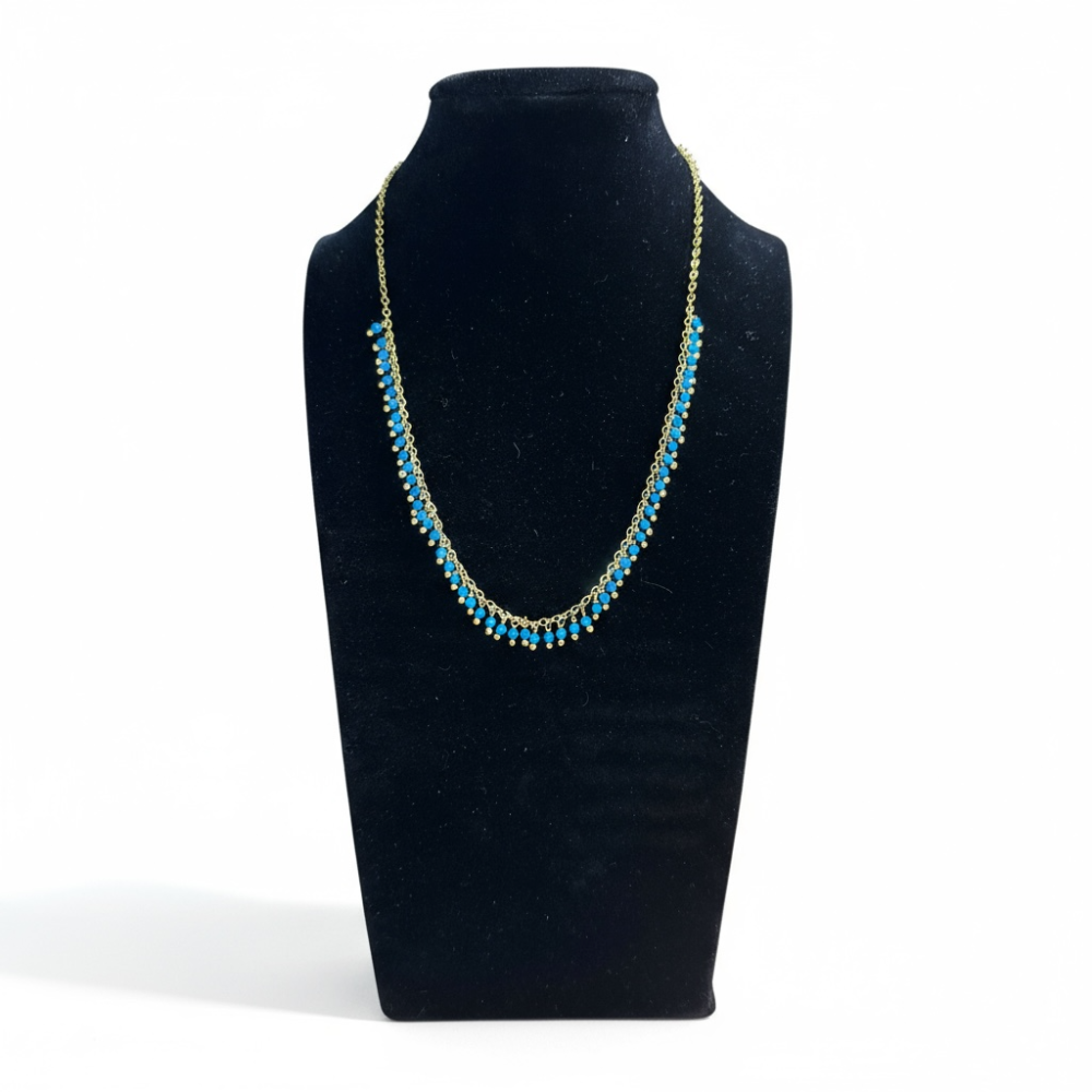أبرزي أناقتك الطبيعية مع هذه القلادة المصنوعة من الفضة 925 والمطلية بالذهب، والمزينة بحجر الفيـروز الطبيعي بلونه الأزرق الهادئ الذي يرمز للصفاء والطاقة الإيجابية. تصميم يجمع بين البساطة والفخامة ليمنحك لمسة من الجمال الأصيل والتوازن في كل إطلالة.
