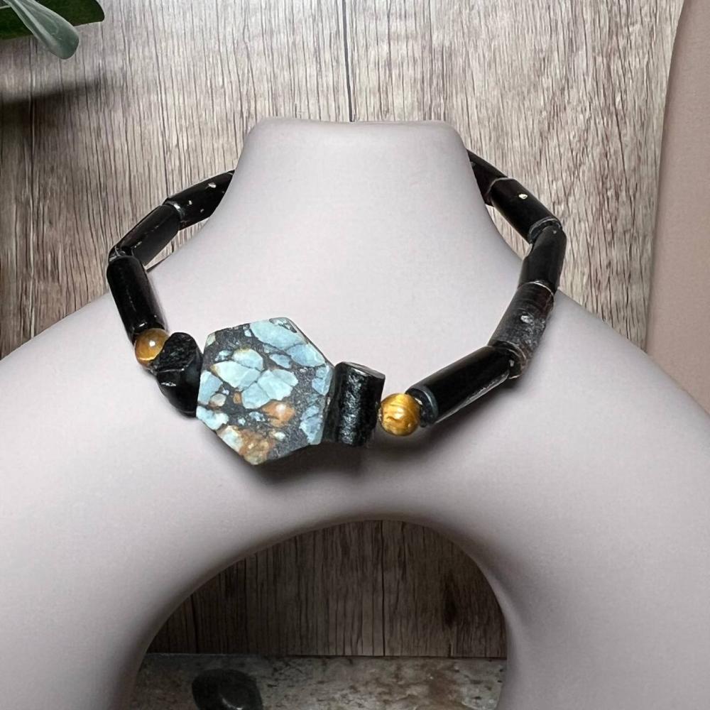 إسوارة رجالية أنيقة تجمع بين حجر اليسر الأسود الطبيعي الذي يرمز للقوة والثبات، وحجر الفيروز بلونه الأزرق الهادئ الذي يعكس الصفاء والطاقة الإيجابية، وحجر عين النمر المعروف بجاذبيته ولمعانه الذي يرمز للتركيز والثقة.